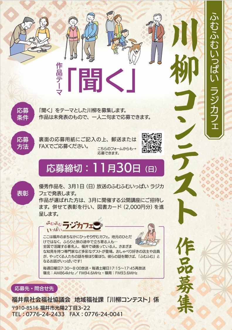 福井県社会福祉協議会の「ふむふむいっぱいラジカフェ」では、「聞く」をテーマとした川柳を募集します。作品は未発表のもので、一人二句まで応募できます。