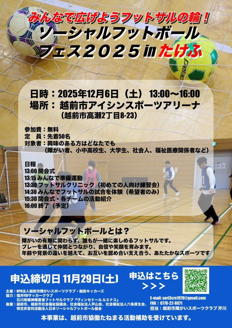 【申込み締切11月29日】「ソーシャルフットボールフェス2025 inたけふ」開催 参加者募集!